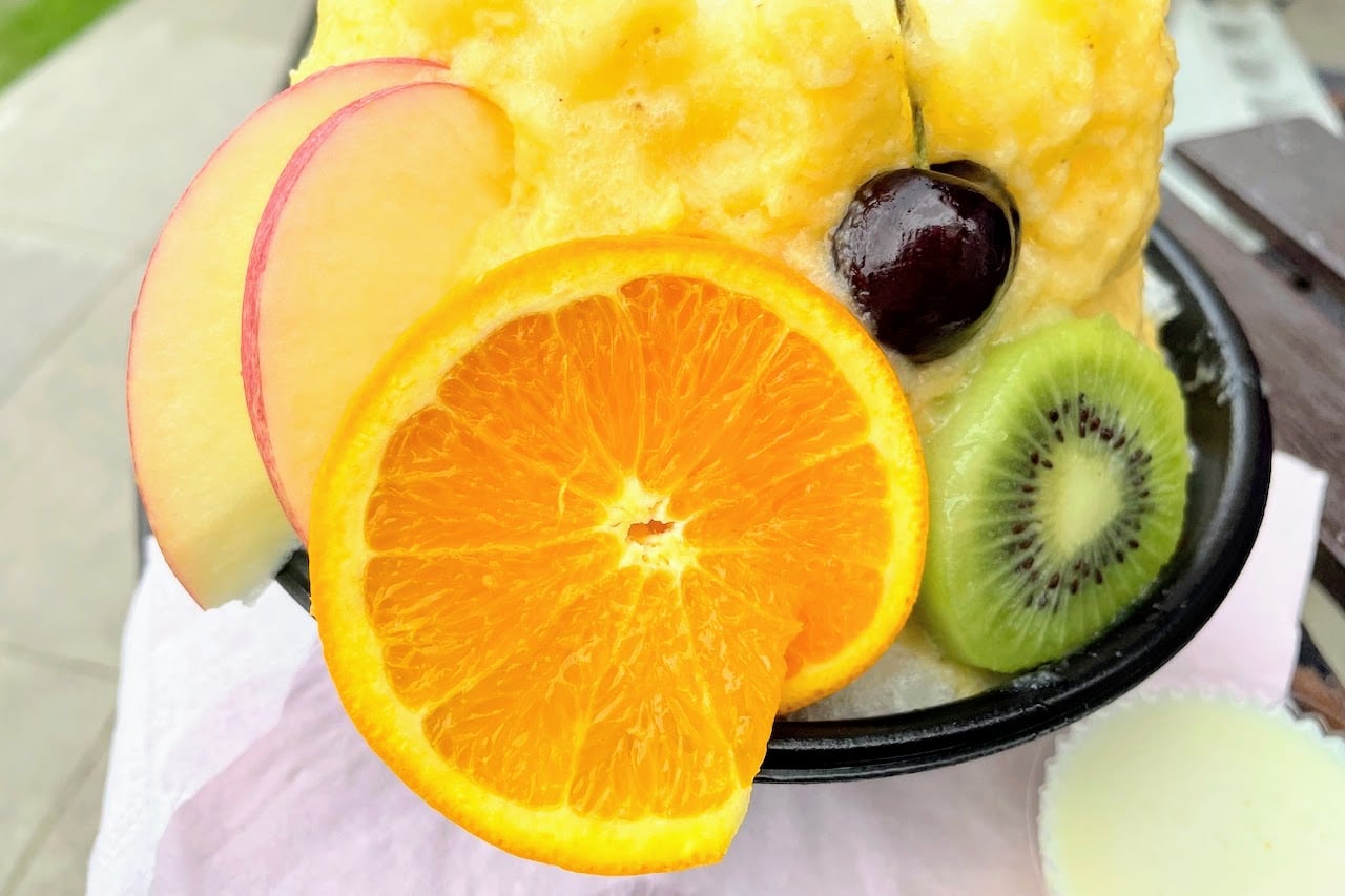 かき氷なのに薄く感じない、フルーツの味が濃厚なミックスジュースシロップがかかっています!