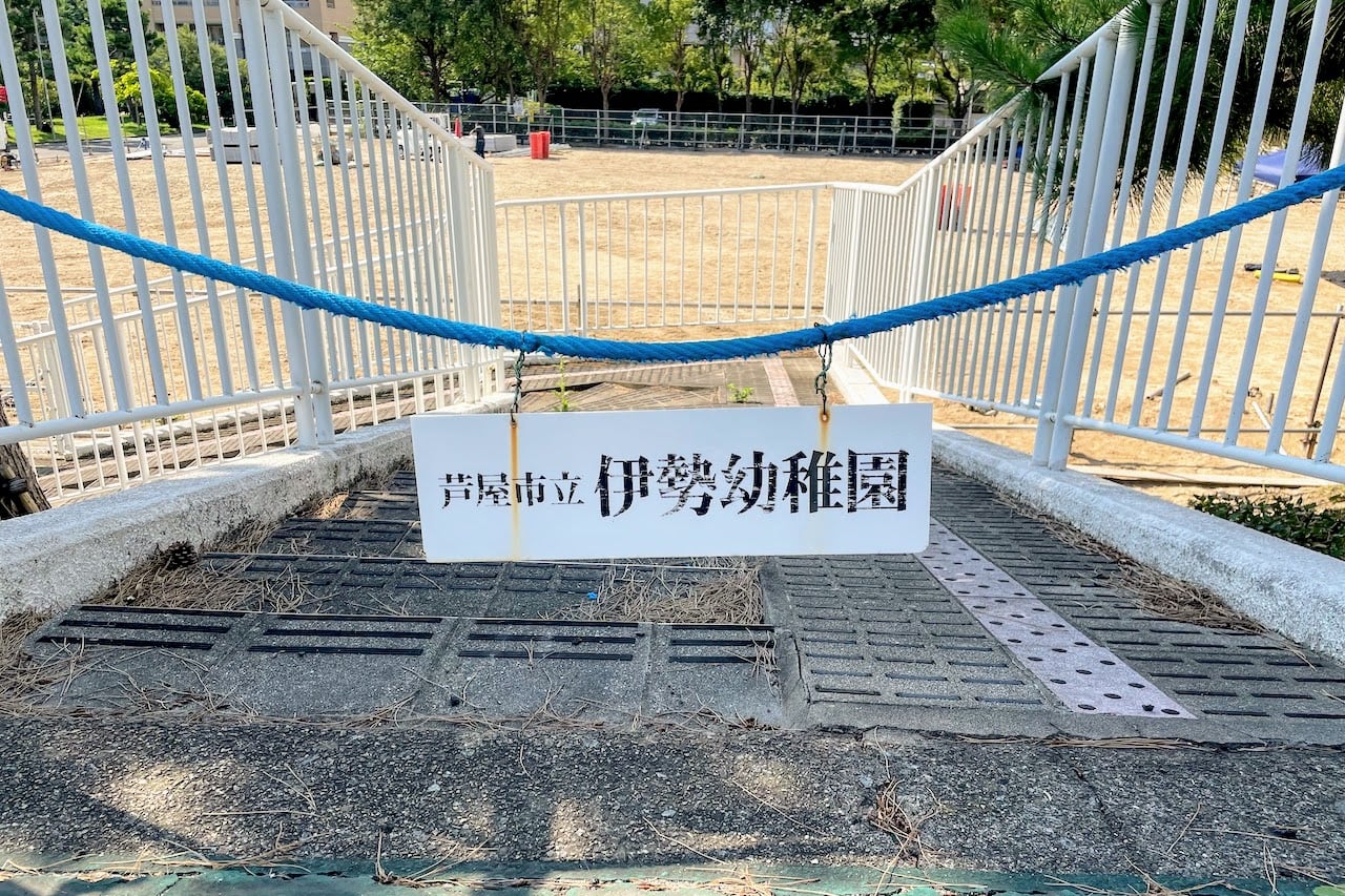 臨港線歩道から直接敷地へ降りる階段には「芦屋市立伊勢幼稚園」の看板がまだ残っていました。