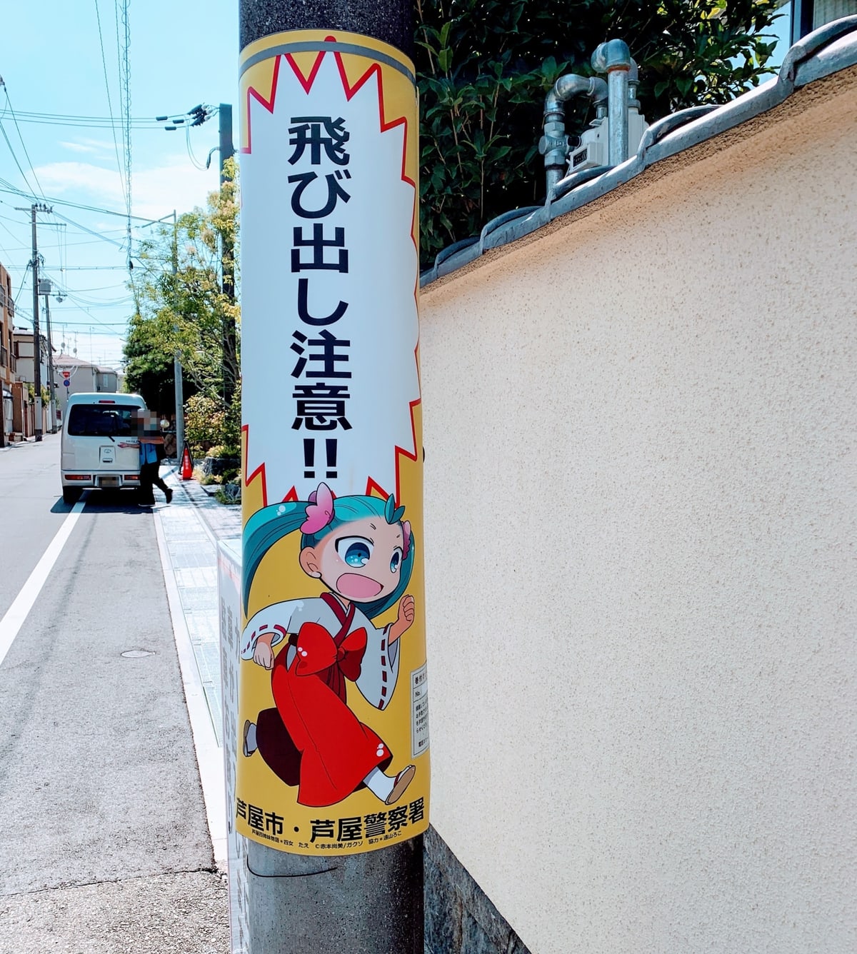 「芦屋四姉妹物語」の飛び出し注意の電柱幕があった【芦屋フォト】