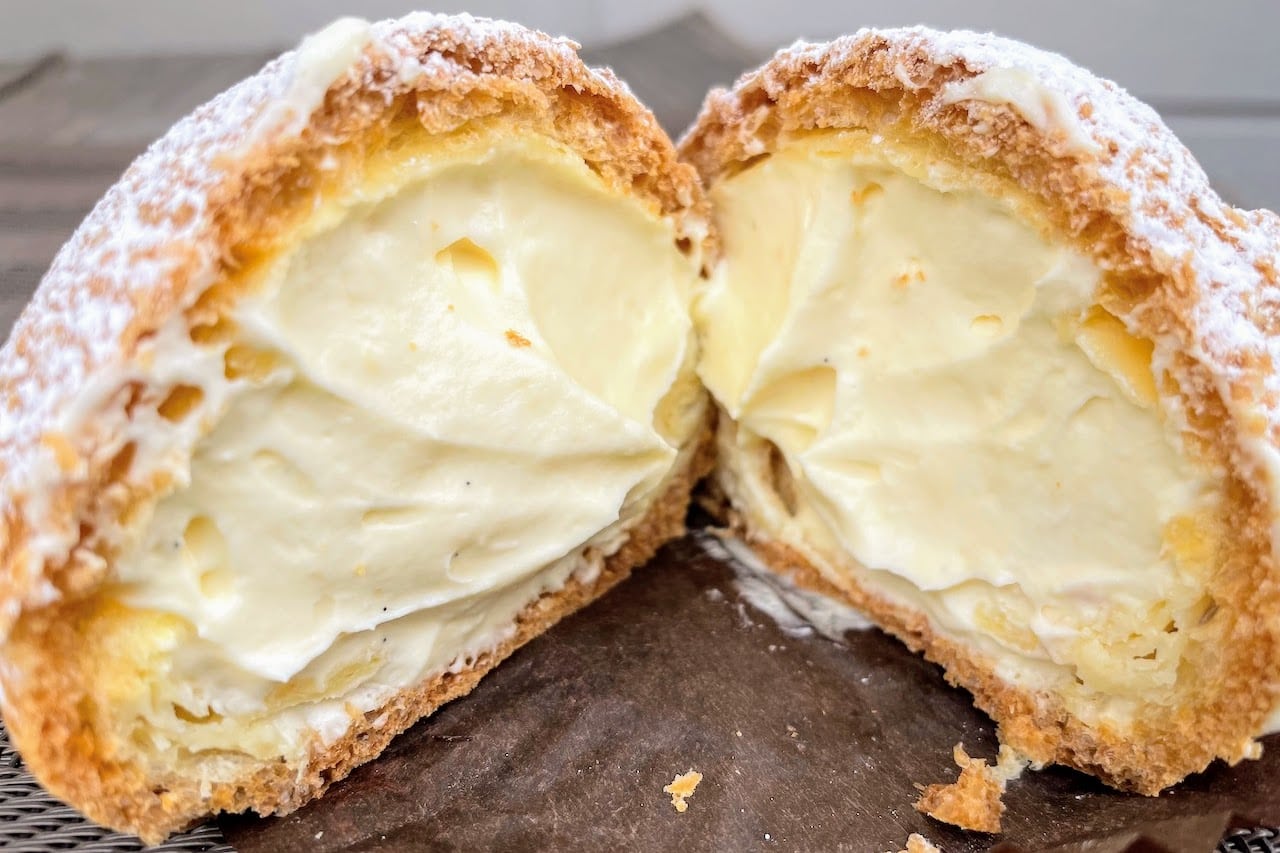 中身は甘さ控えめでとってもなめらかなカスタードクリーム!上の粉砂糖が甘いので、あわせると丁度いい甘さになりますね〜