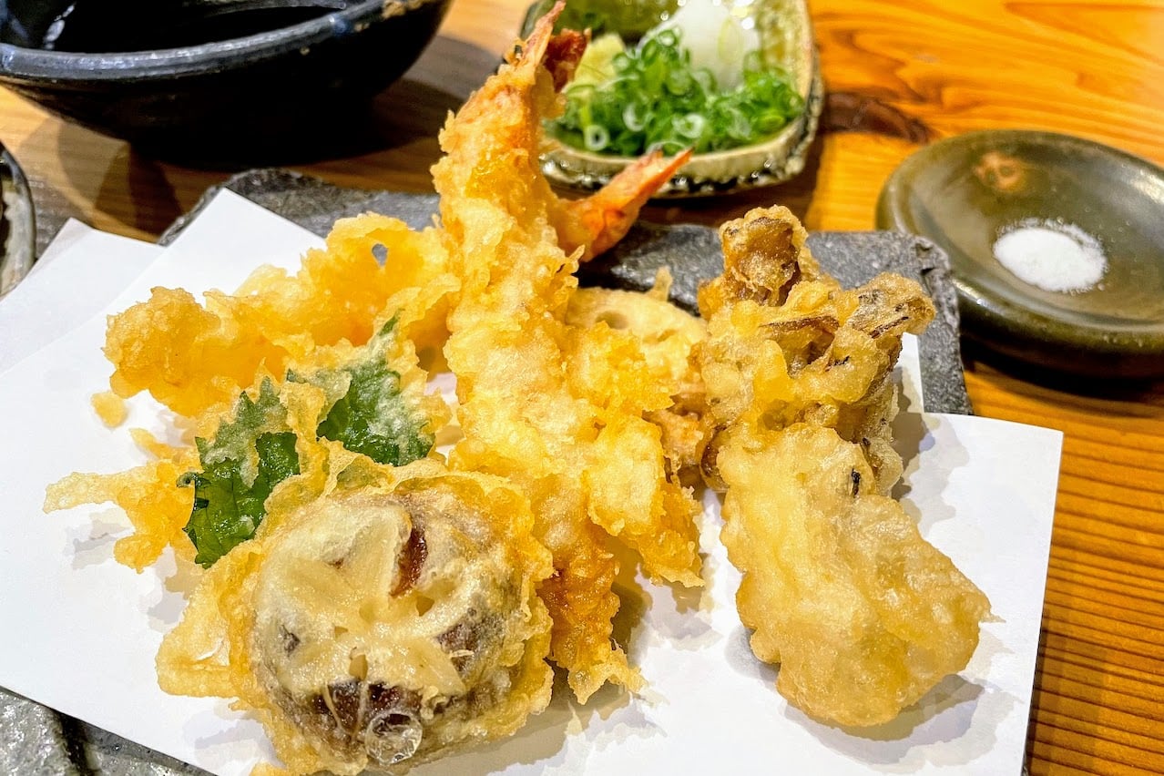天ぷらの内容は、海老2尾、舞茸、しいたけ、大葉、れんこんでした!