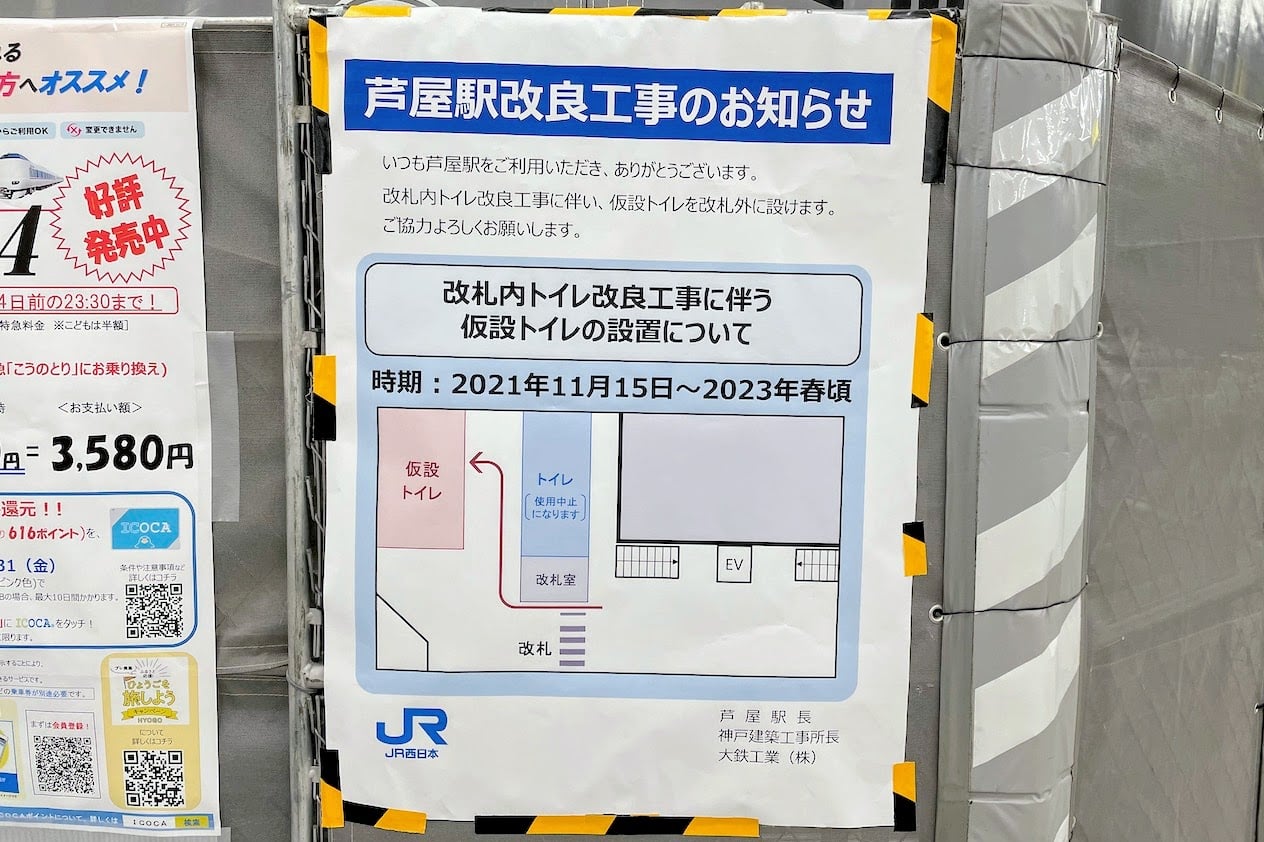 JR芦屋駅の改札内トイレ改良工事に伴い、11月15日から改札外に仮設トイレができていました。