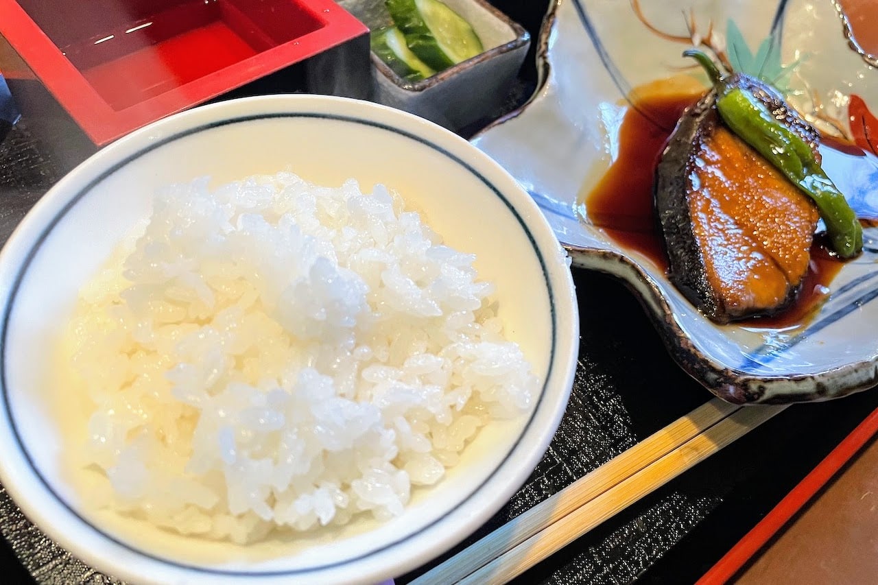 本日の魚の一品、小鉢、ご飯、味噌汁、香の物がセットになっています。ん?ご飯は…?