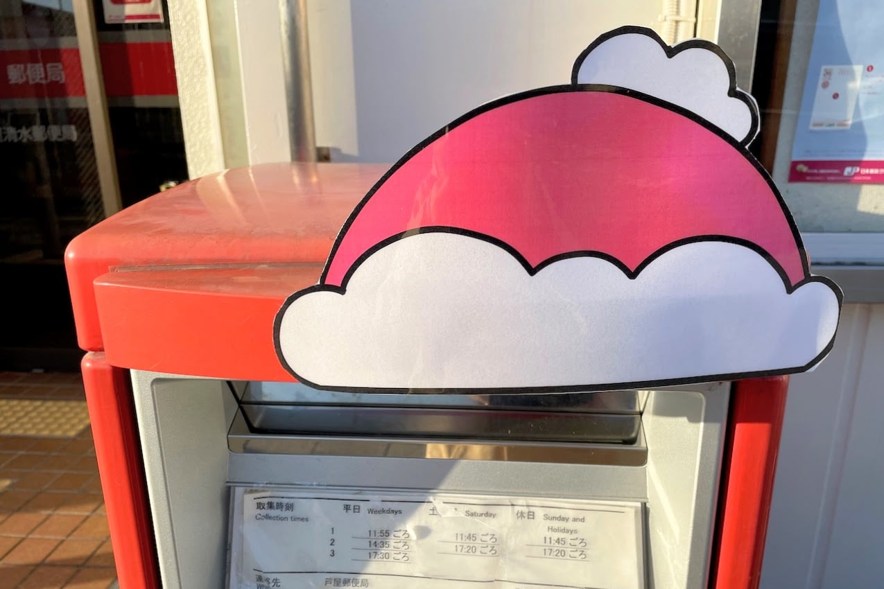 投函口と収集時刻表があるひろーいおでこの上にはサンタ帽が。