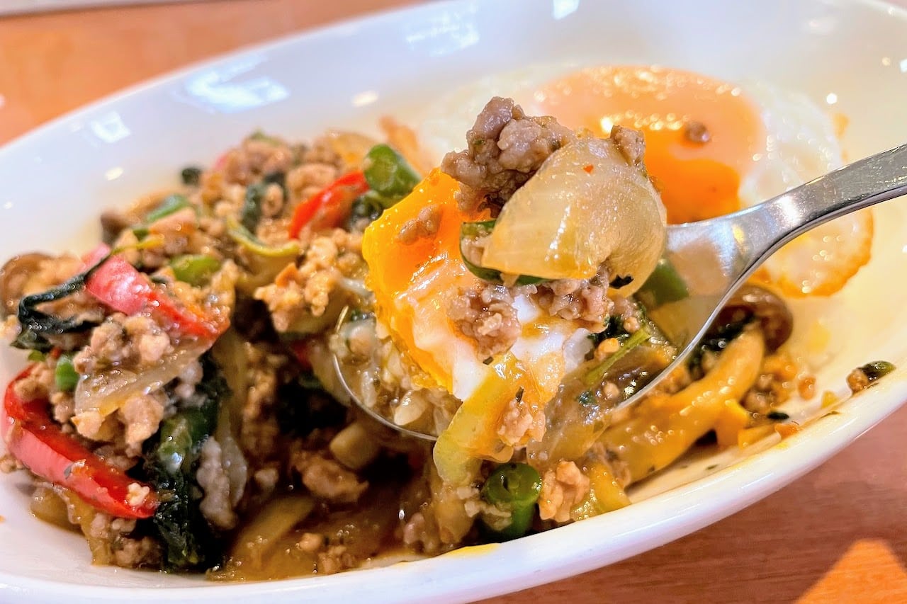 しっかりバジルの味がして、本格派ですが辛味は程よく食べやすいガパオライスです〜