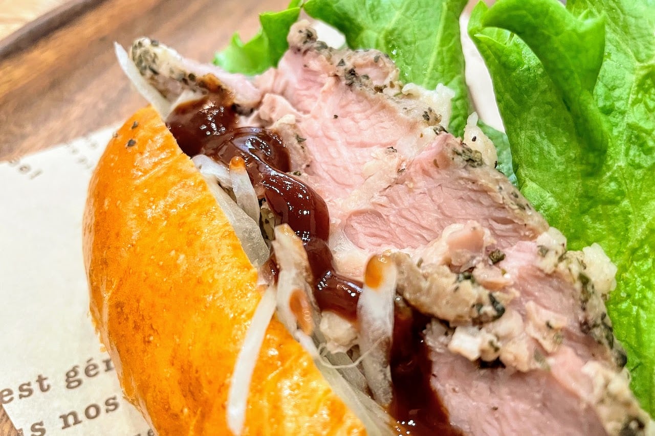 ホットドッグ風のパンに、ローストポークとレタス、玉ねぎなどが挟まっていて、BBQ風ソースとマスタードで味付けされています〜