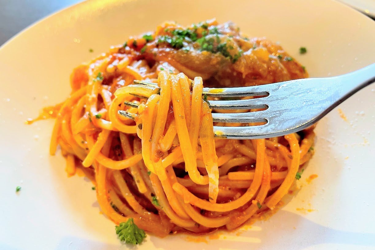 ↑しっかりとコシのある麺に、トマトと玉ねぎの素朴な甘みとニンニクやオレガノの風味がしっかり感じられるソースが絡みます〜