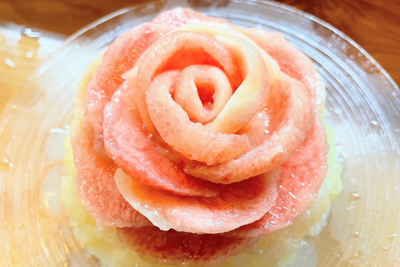 ↑オープン直後はとってもかわいいお花型に盛り付けられたかき氷が提供されていました!(混雑具合などにより、角切り桃の場合もあるようです〜)