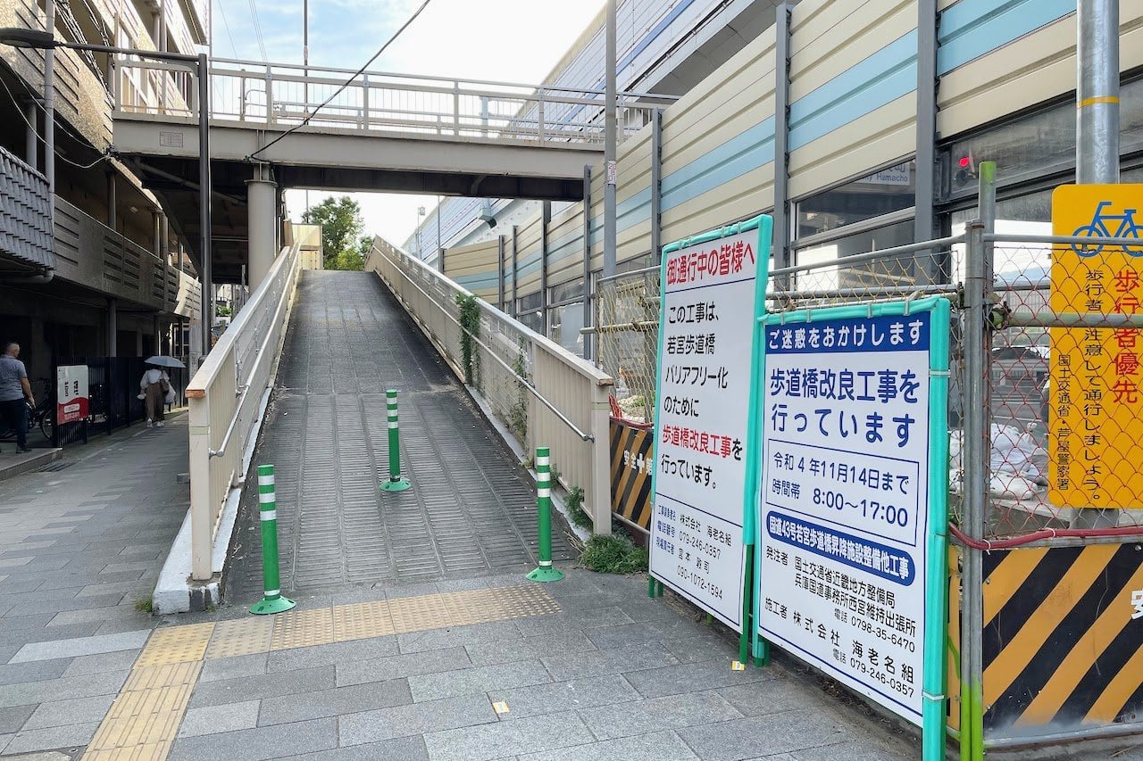 阪神打出駅近く、国道43号線にかかる「若宮歩道橋」で、現在バリアフリー化工事が行われています〜