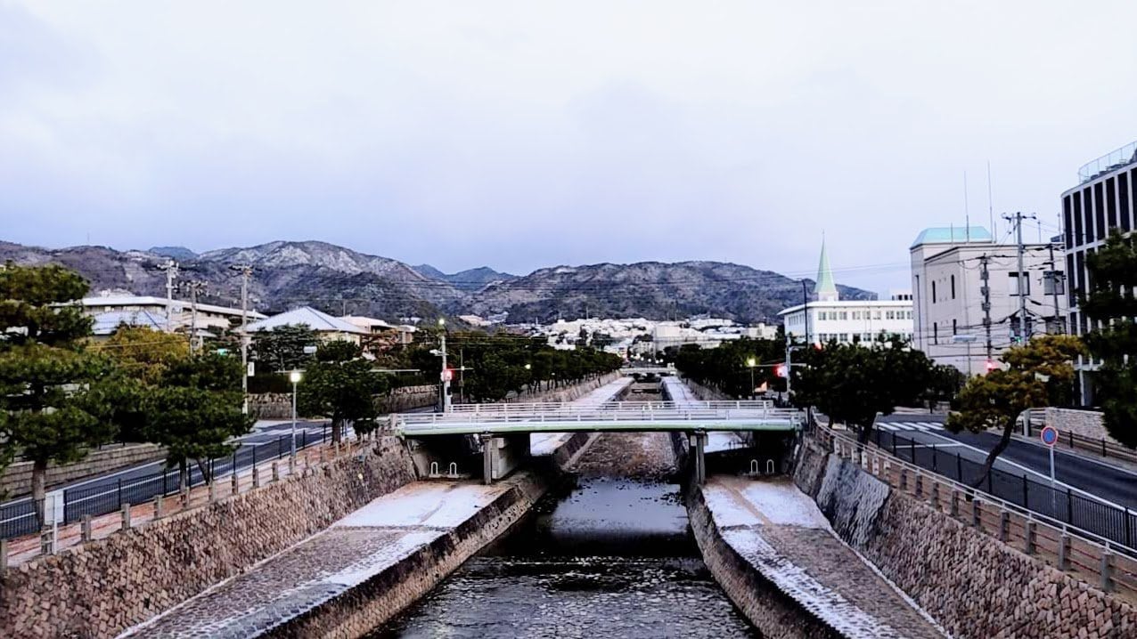 ↑芦屋市公式Instagramアカウントの鵺塚橋から見た雪がうっすら積もる芦屋川の写真