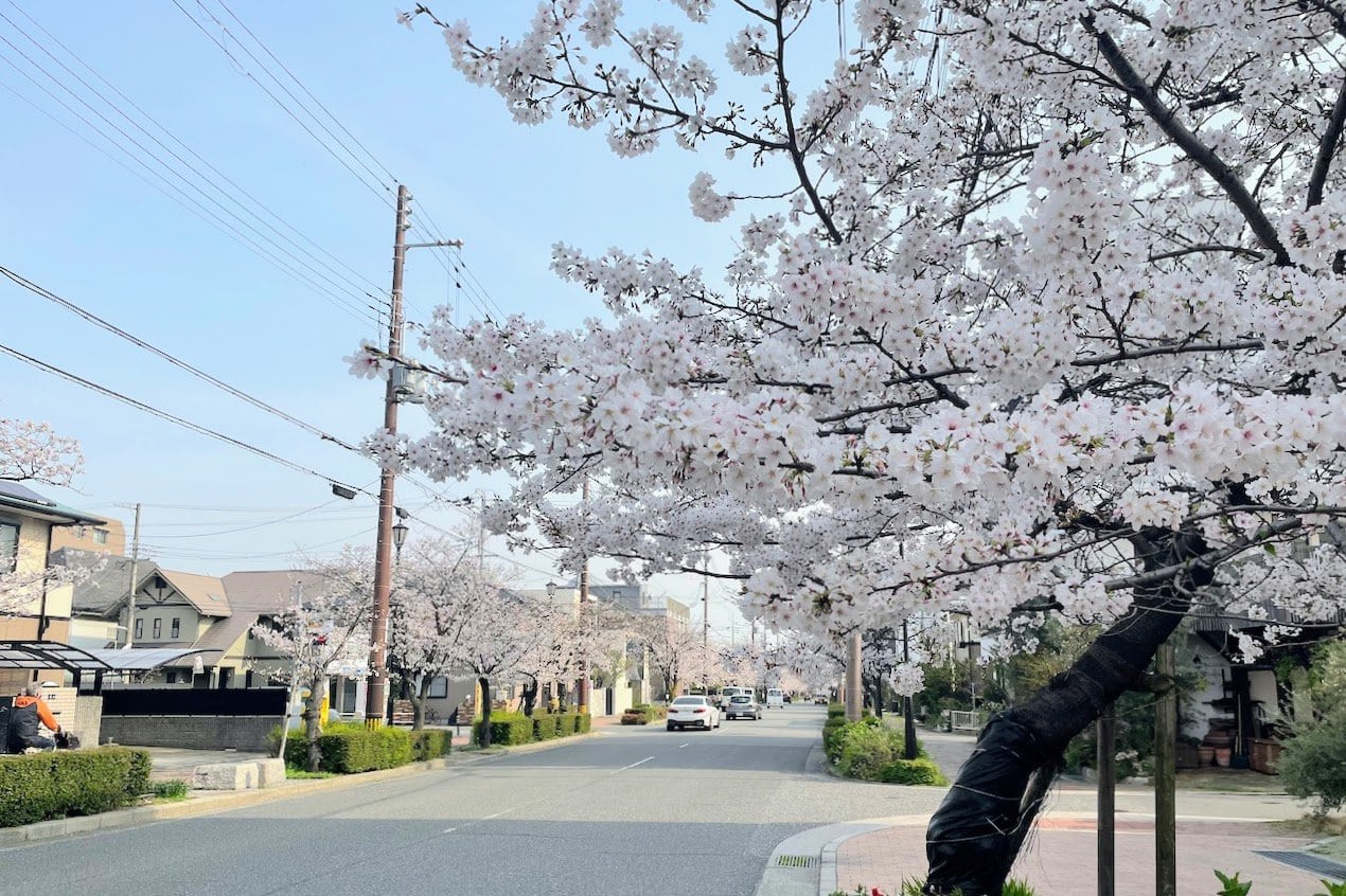 ↑こちらは「さくら通り」川西町付近の様子。木によっては上の方がまだつぼみですが、下の方はかなり咲いてて見頃です。