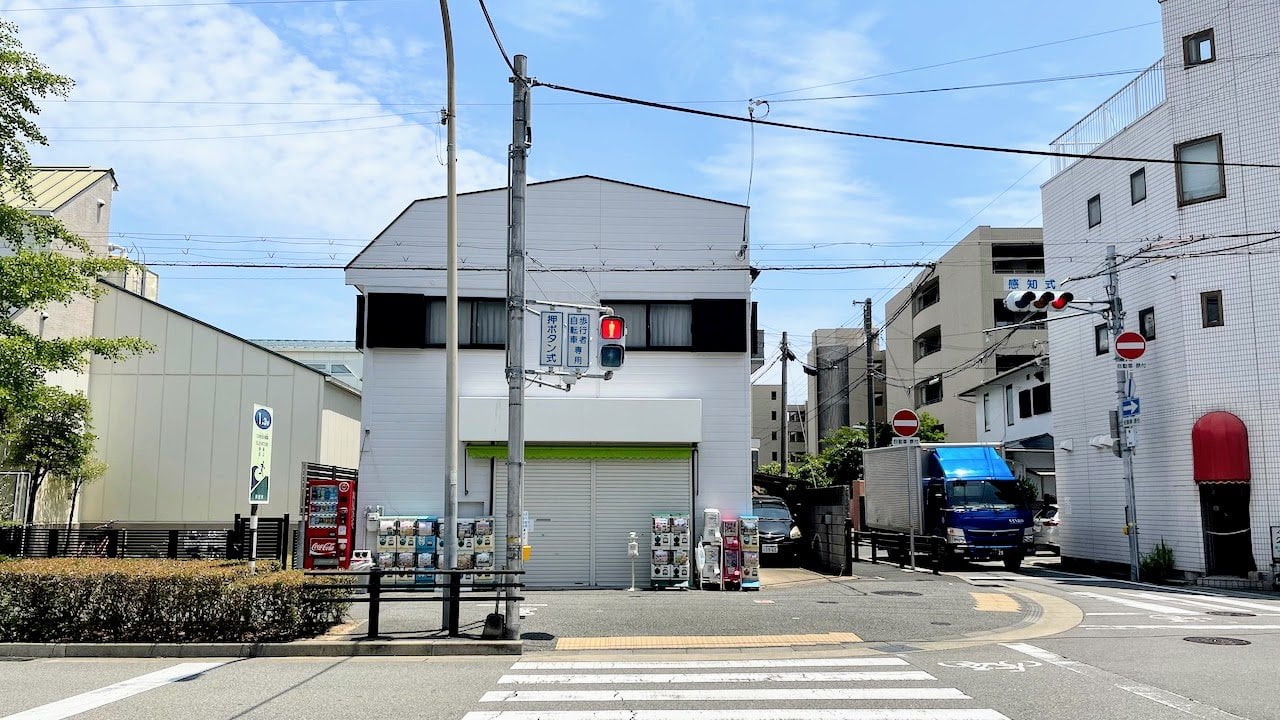 ↑稲荷山線の東側、路地との角地にあるお店です。向かって右の路地をまっすぐ行くと精道中学校があります。