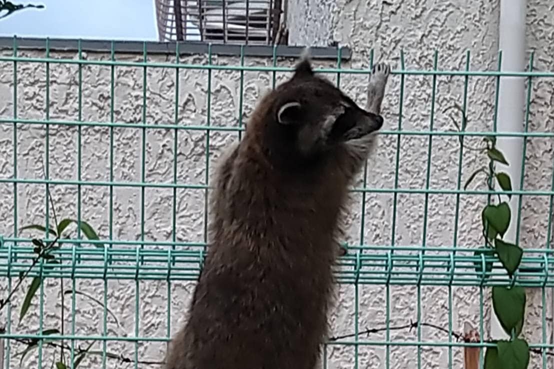 ↑さらにアップの写真も!金網をしっかりと掴む器用そうな前足、顔の模様、シマシマの長いしっぽ…これはアライグマで間違いないですね!
