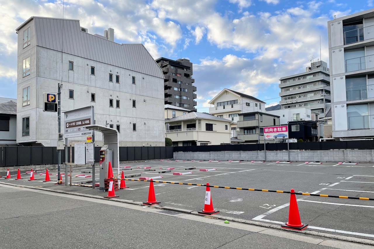 茶屋之町・茶屋さくら通りから西へ入った路地沿いの時間貸し駐車場「コインパーク 芦屋茶屋之町第2」が、1月25日をもって閉鎖されていました。