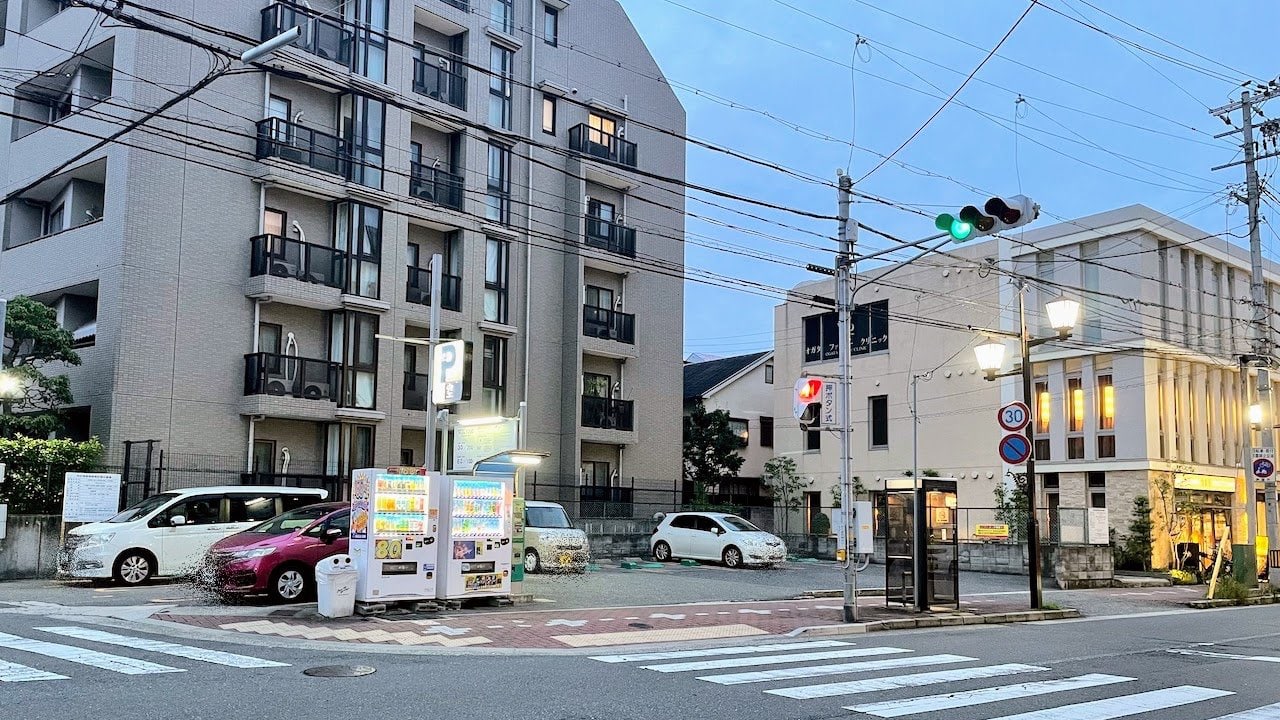 ↑駅前通りの北側、「鳥貴族 芦屋店」の向かって左隣の駐車場です。角には自動販売機があります。