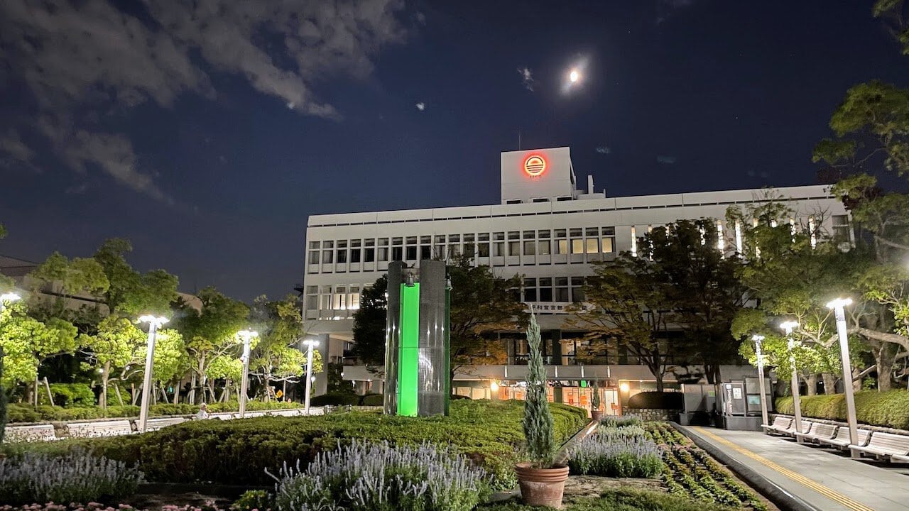 阪神芦屋駅近くにある芦屋市役所・北館(本館)の上にある市章がオレンジ色にライトアップされてました〜