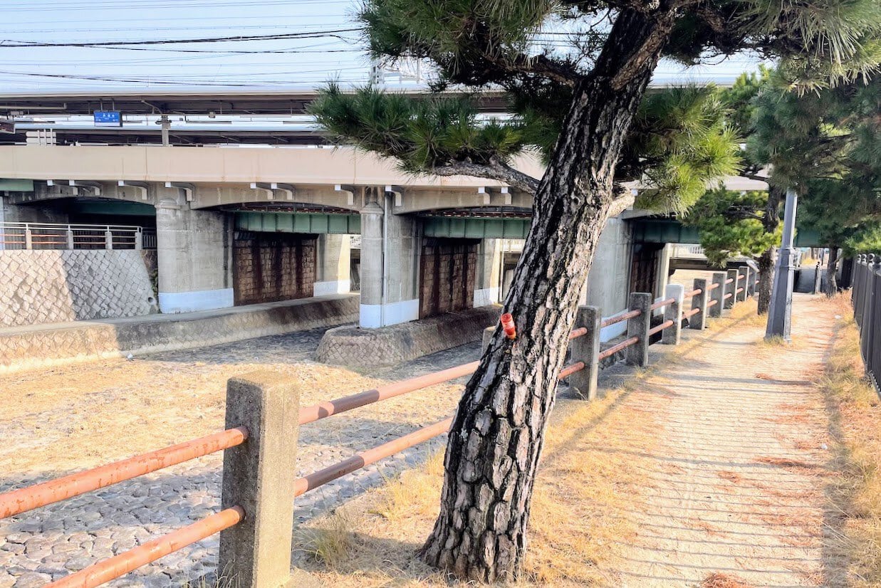阪神芦屋駅近くの芦屋川沿いにある松の木なんか刺さってるの、気づいた人いますか〜