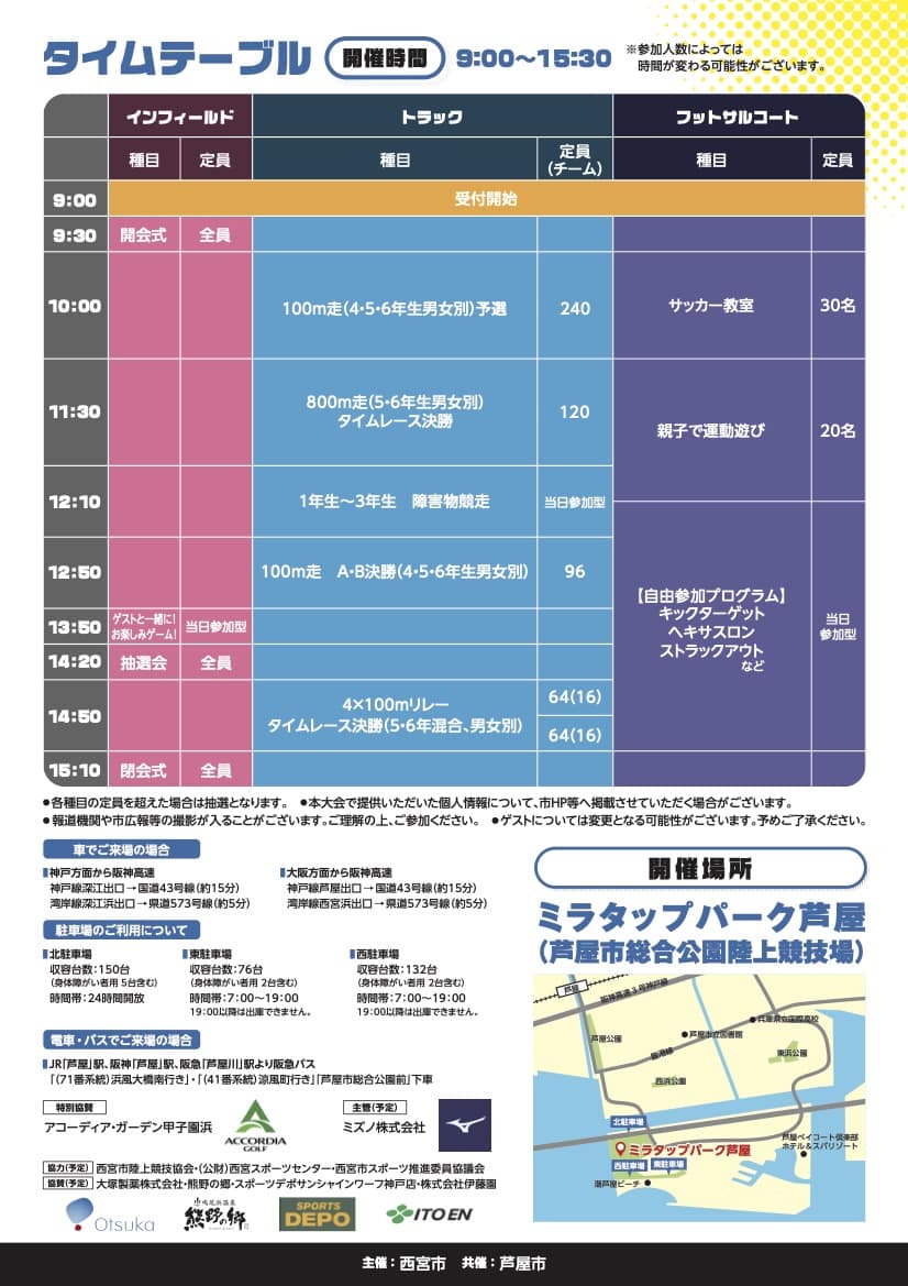 以前は「西宮市小学生陸上競技大会」として「西宮中央運動公園」で開催されていたイベントだそう〜。芦屋市での開催となった今回からは陸上競技だけでなく、スポーツに関連した催し盛りだくさんになってます!