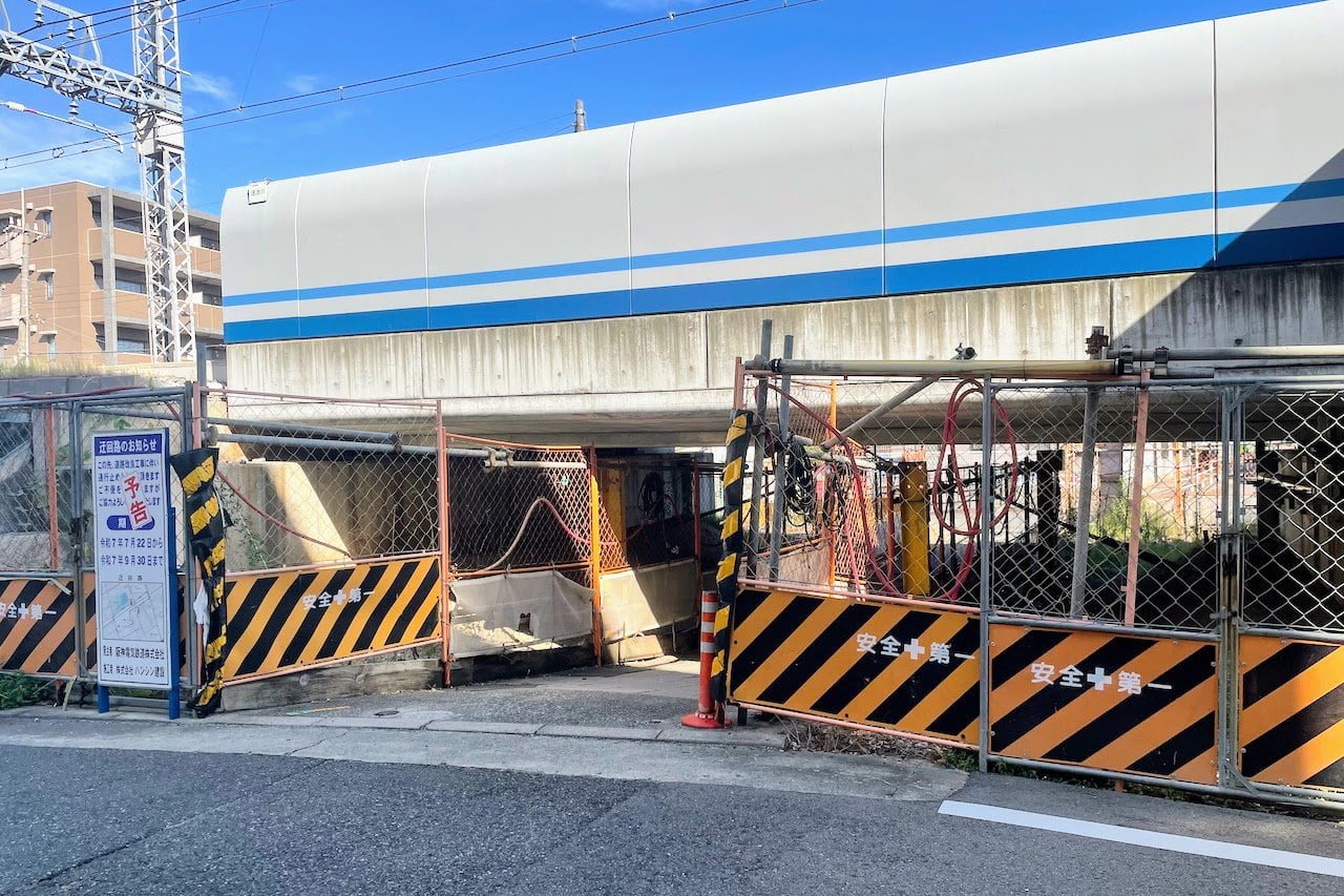 ↑北側から見たようす。周りが工事用フェンスで囲まれた、細くて低いトンネルになっています。