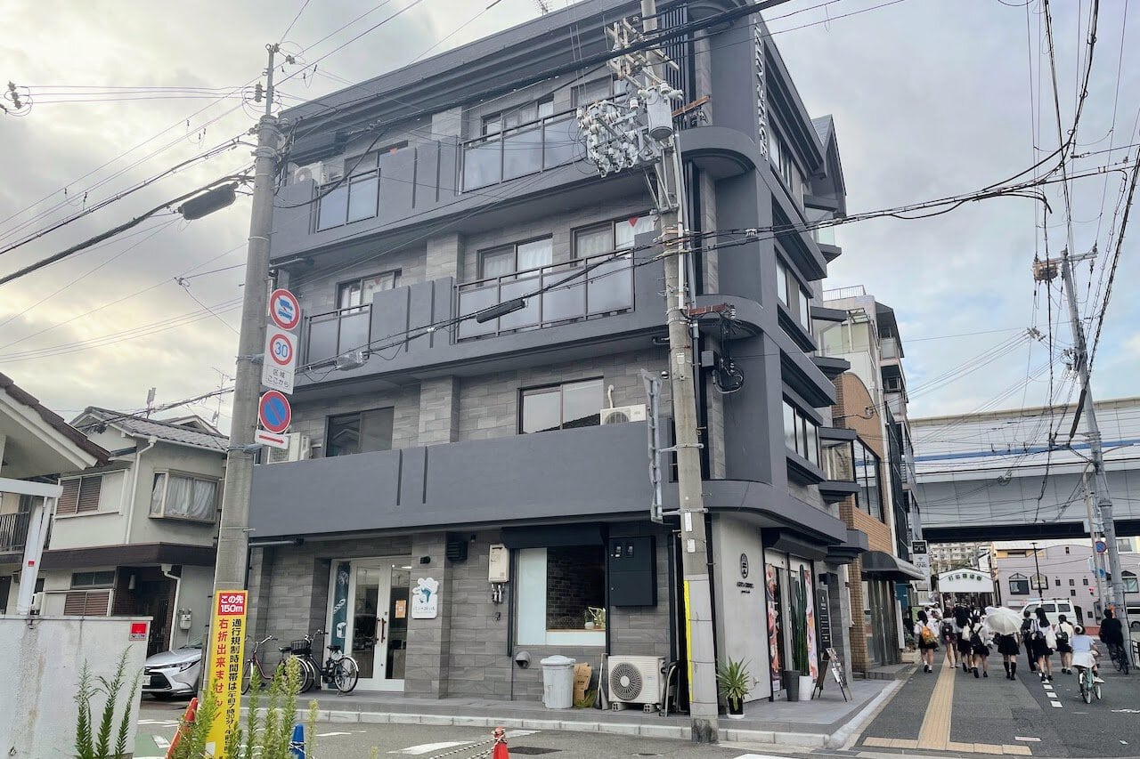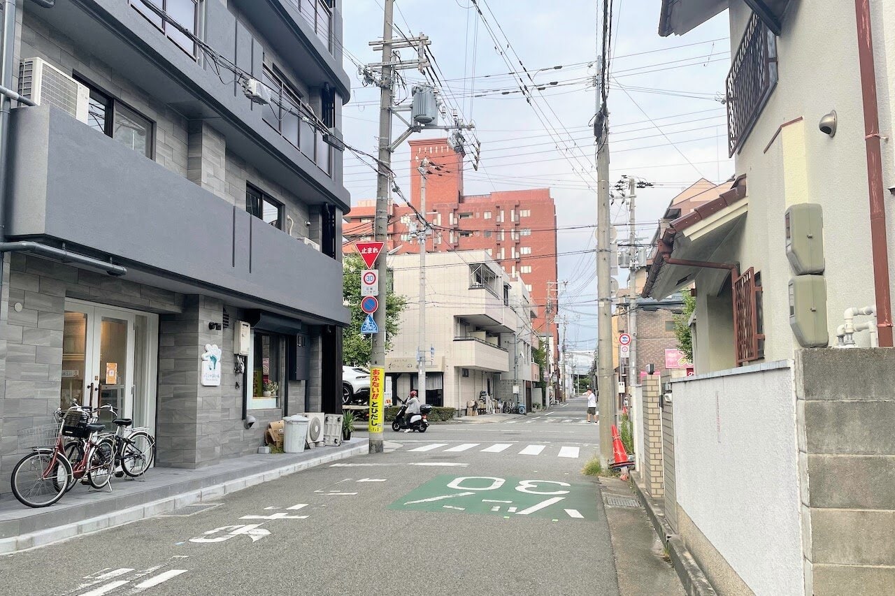 ↑稲荷山線と路地の角地にあるマンション「メインステージ芦屋浜町Ⅱ」の1階、南向きに入り口があります。同建物の1階(稲荷山線側)には、「芦屋麒麟堂」があります。