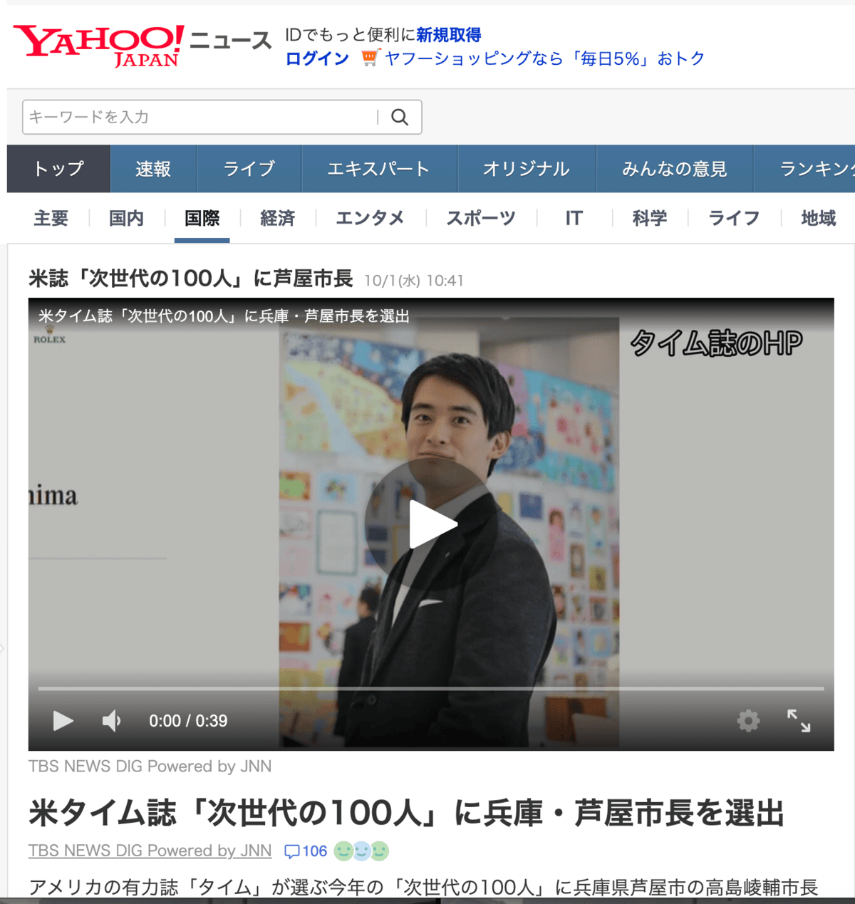 アメリカの雑誌「TIME」が発表した今年の「次世代の100人」に、高島崚輔芦屋市長が選ばれたみたいです〜
