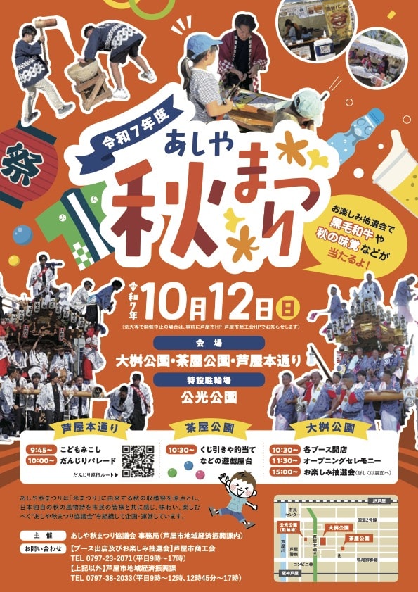 大桝町にある「大桝公園」と茶屋之町にある「茶屋公園」で、「第37回あしや秋まつり」が10月12日(日)9:30~16:00に開催されるそうです〜!