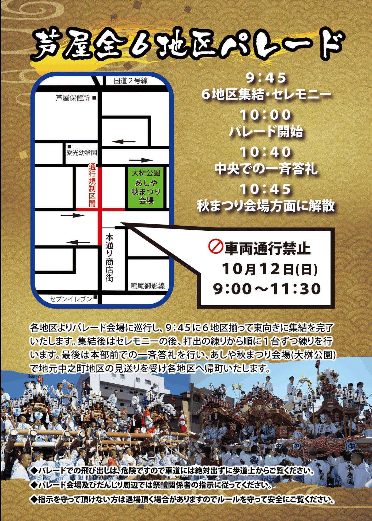10月12日(日)9:45からは、芦屋本通りに芦屋市内各地区の地車が集まる「だんじりパレード」も開催予定!