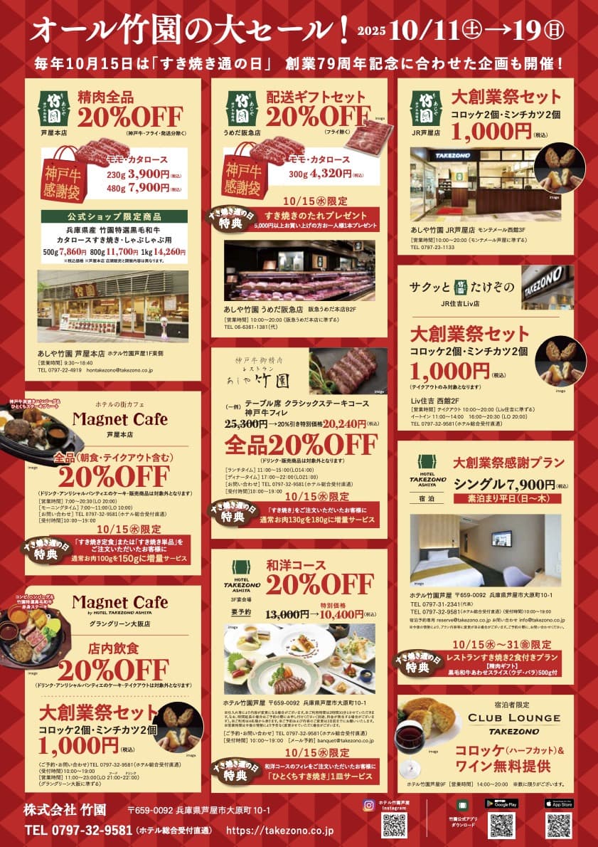 JR芦屋駅前にある「あしや竹園」の系列全店で、「79th Anniversary 大創業祭」が10月11日(土)〜19日(日)に開催されるみたいです〜