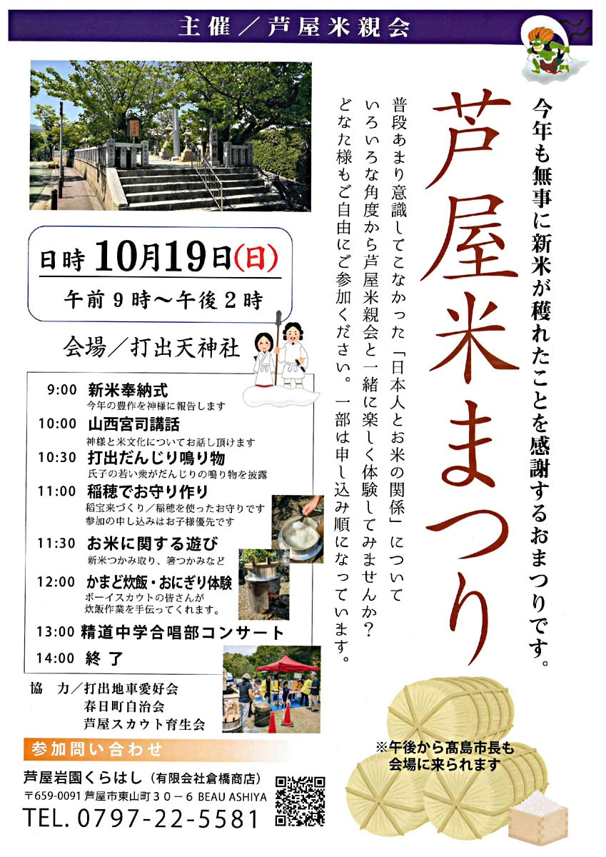 打出天神社で「芦屋米まつり」が10/19(日)に開催されるみたい。新米販売、かまど炊飯体験や稲穂のお守り作りなど