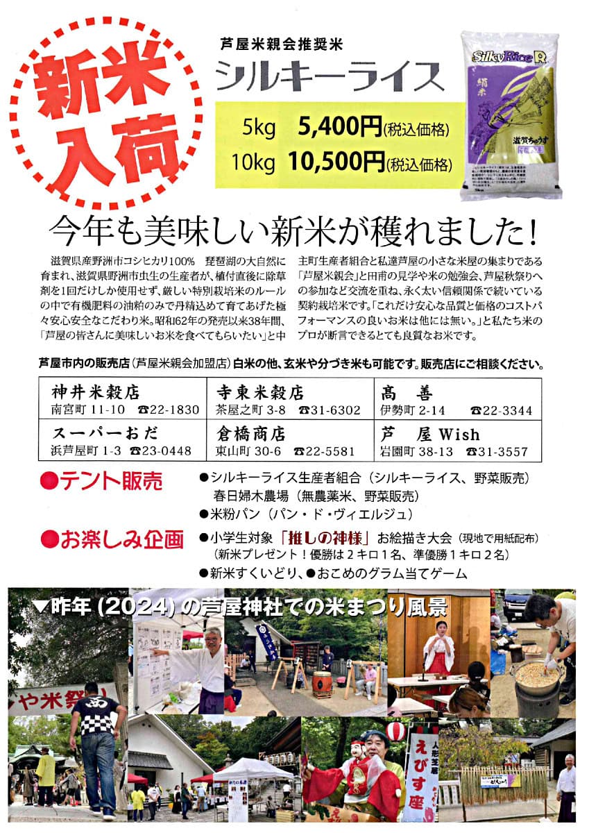 昨年は芦屋神社で開催されたお祭りが、今年は打出天神社で開催!今年の新米が買えるだけでなく、お米に関する様々な体験が楽しめますよ〜!小学生はお絵描き大会で新米が無料でもらえるチャンスまであるので、ぜひ親子で参加してみてはいかがでしょうか。