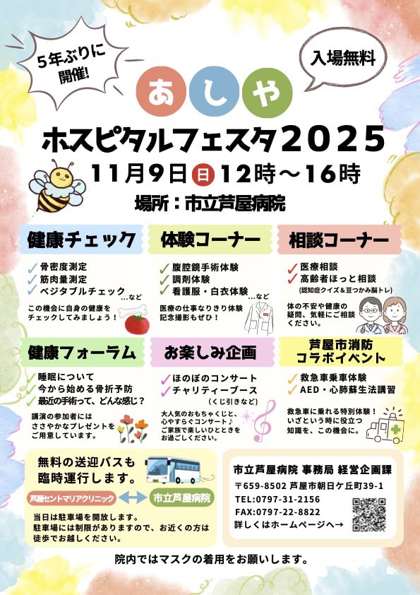 朝日ケ丘町にある「市立芦屋病院」で「あしやホスピタルフェスタ2025」が11月9日(日)に開催されるようです。