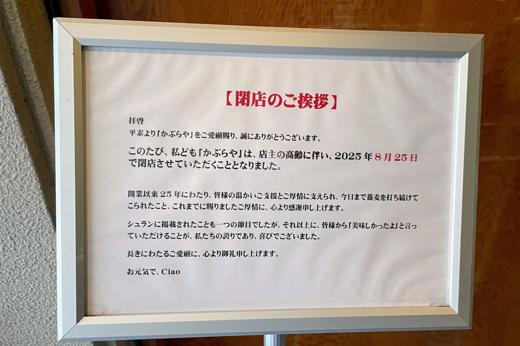 ↑この場所では十割蕎麦と鴨の店「かぶらや」が営業していましたが、今年8月に閉店しています。閉店の挨拶が残っていました。