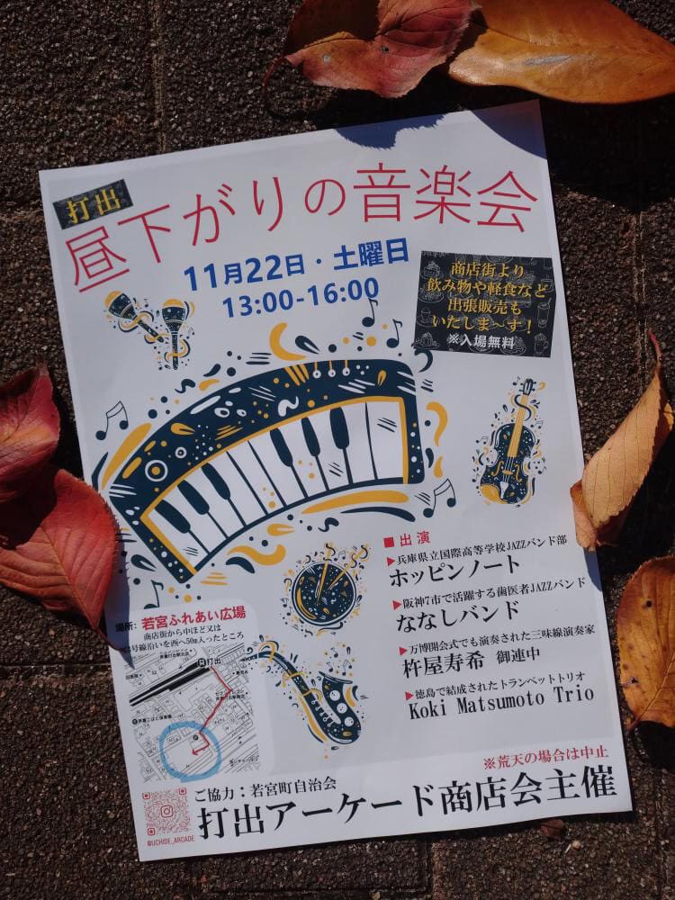 阪神打出駅近くにある「若宮ふれあい広場」で、打出アーケード商店会主催の「昼下がりの音楽会」が11月22日(土)13:00から開催されるみたいですよ〜! ※荒天の場合は中止