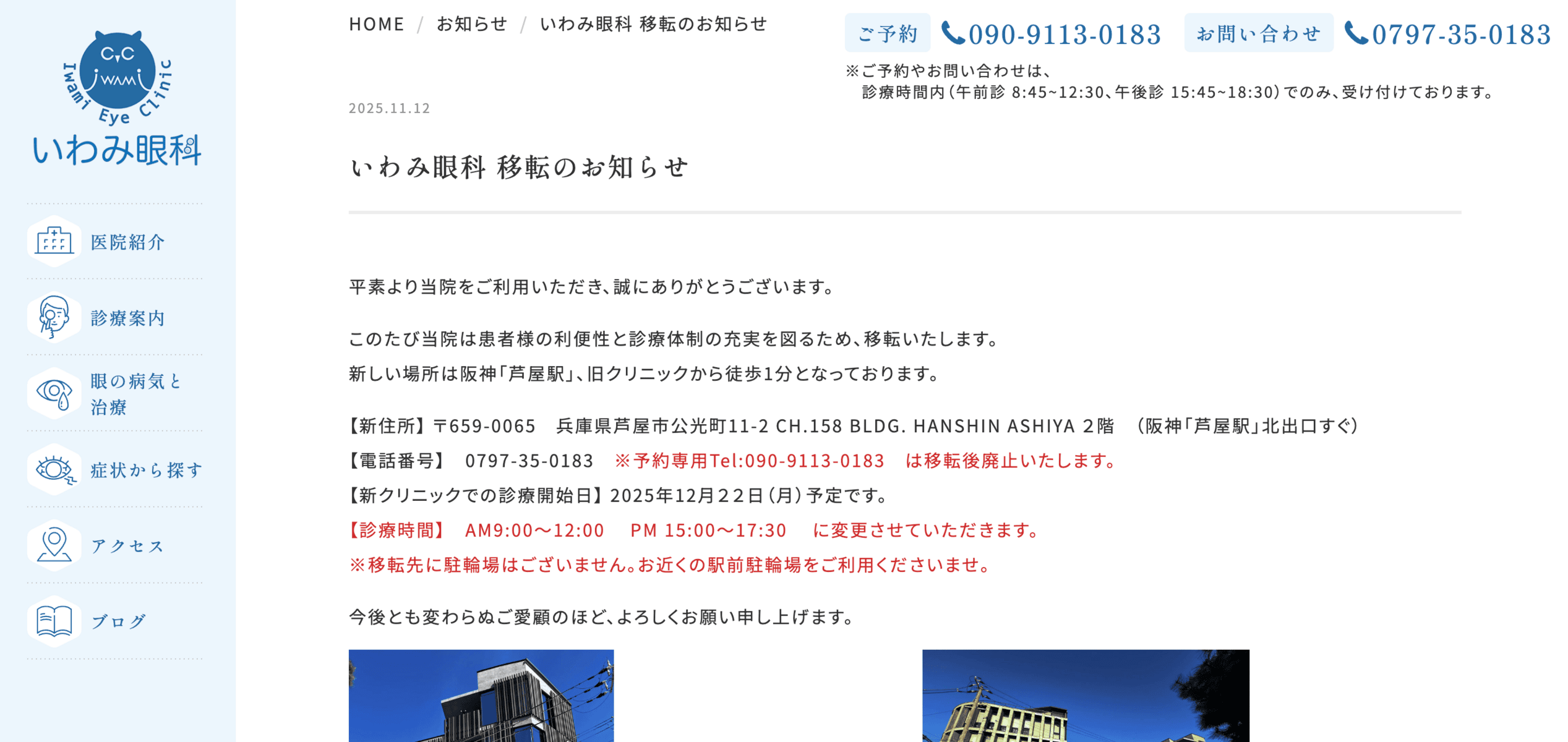 阪神芦屋駅近く、鳴尾御影線沿いの「芦屋山下ビル」4階にある「いわみ眼科」が、12月22日(月)から2軒隣の新築医療ビルへ移転するみたいです。