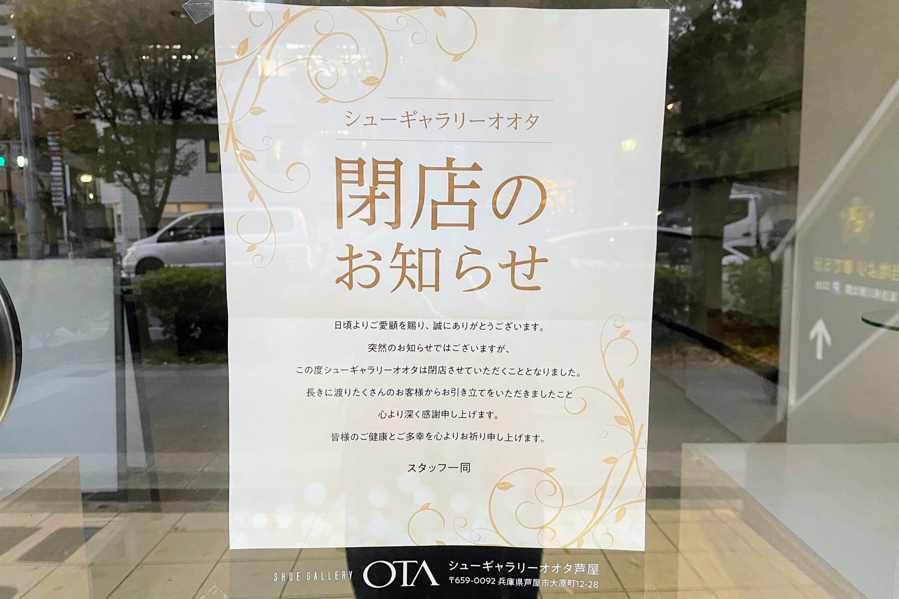 JR芦屋駅近く、山手幹線沿いにあった靴店「シューギャラリーオオタ 芦屋店」が閉店していました。