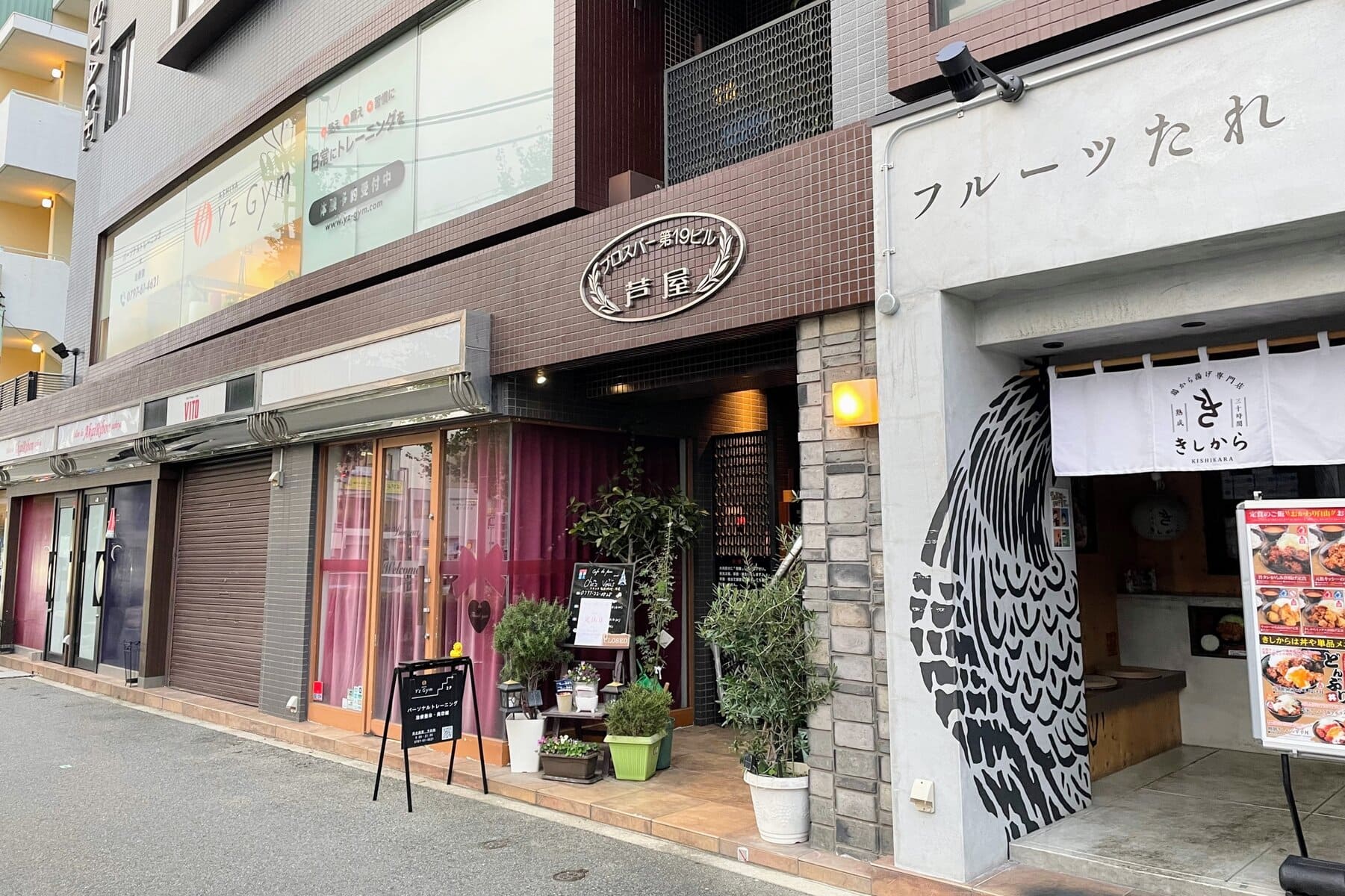 ↑JR芦屋駅のすぐ東側にある、南北に走る通り沿いにあるビルです。同建物内には唐揚げ店「きしから」、フランス料理店「Chez vous」、パーソナルトレーニングジム「Y’z Gym」などが入っています。