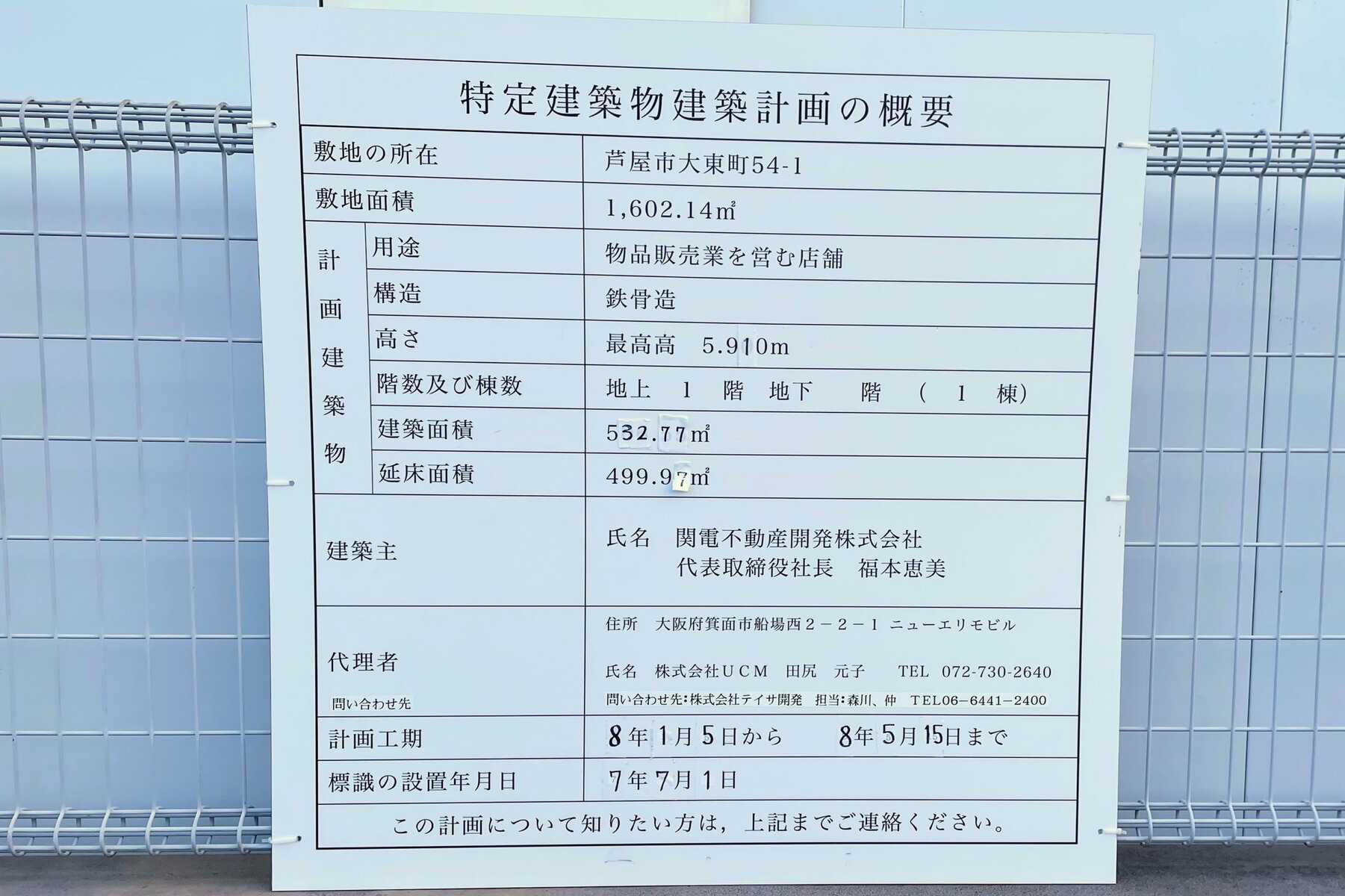 建築主は「関電不動産開発株式会社」(よくテレビでCMやってた会社ですね〜)。計画工期は来年1月5日から5月15日までとなっています。