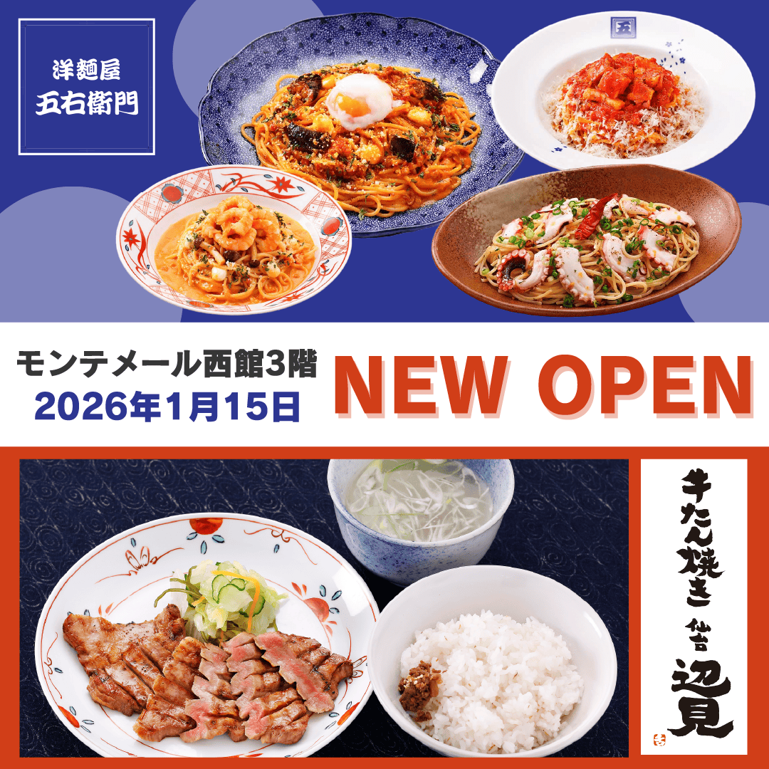 JR芦屋駅直結のショッピングモール「モンテメール」西館3階の「牛たん焼き仙台辺見」と「洋麺屋五右衛門」は1月15日(木)からオープン予定みたいです〜