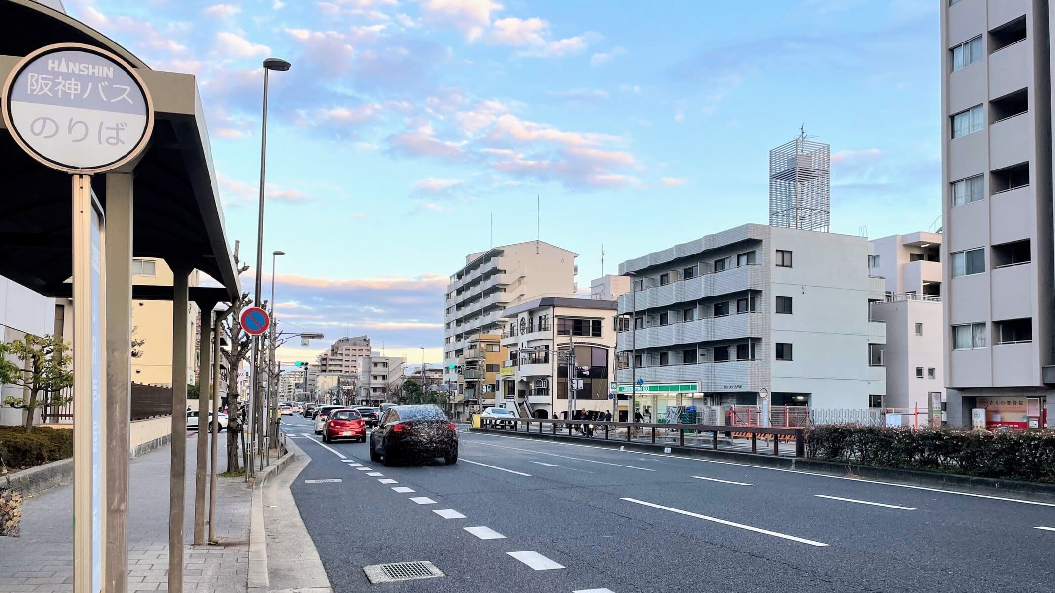 ↑国道2号線の南側、阪神バス「JR芦屋駅前」バス停の目の前です。向かって左隣には「ローソンストア100 芦屋宮塚町店」、右隣には「さくら整骨院」があります。