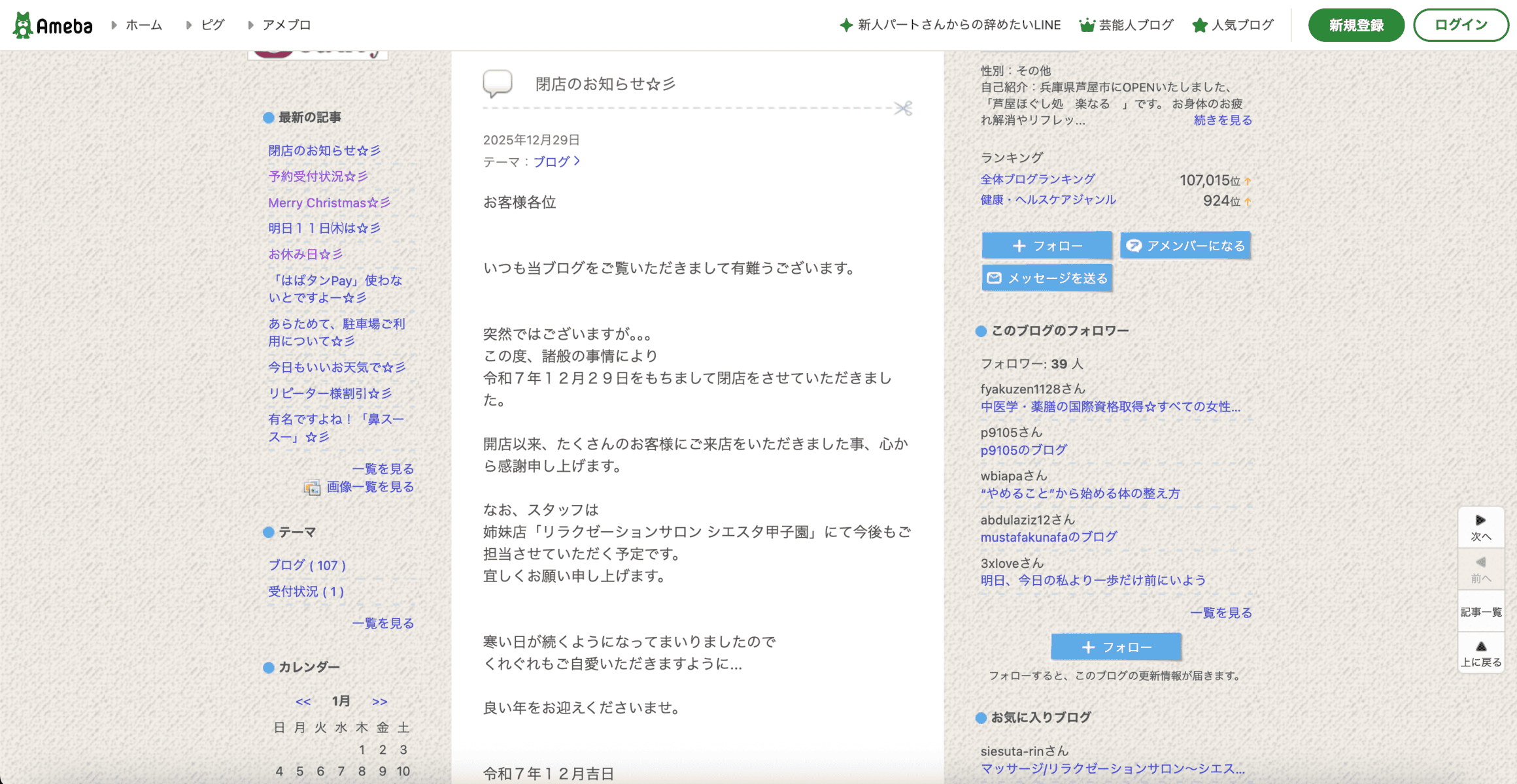 ↑アメブロで閉店のお知らせが出ていました。「楽なる」のスタッフさんたちは今後、姉妹店「リラクゼーションサロン シエスタ甲子園」で施術するそうです〜