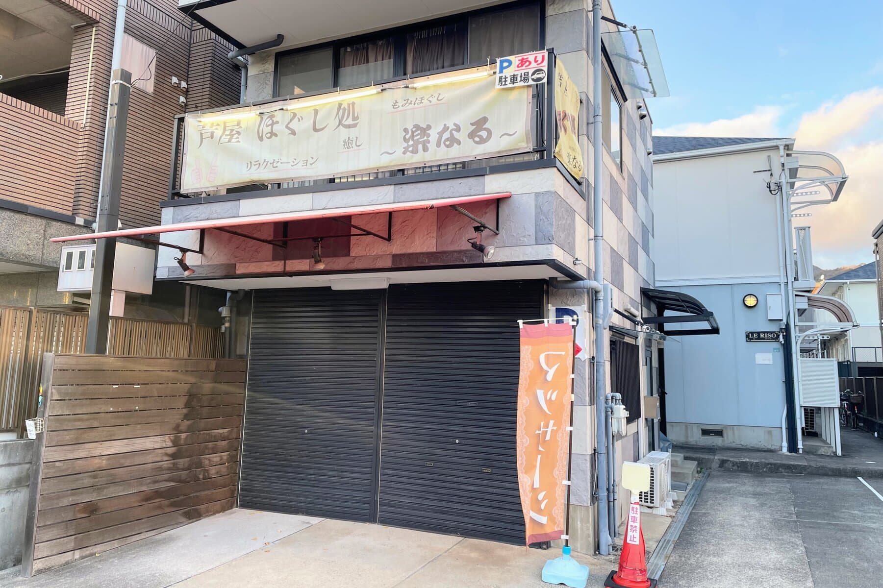 ↑「芦屋ほぐし処~楽なる~」外観。2022年10月に開店したお店でした。「楽なる」の前は小鳥と小動物の専門ペットショップ「さくらぶばーど芦屋」があった場所です。