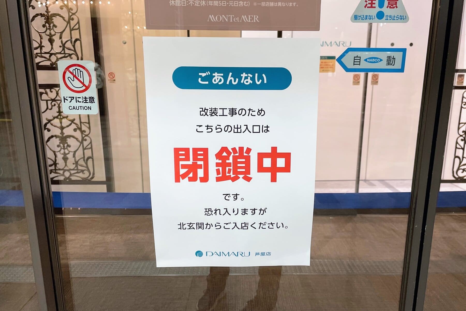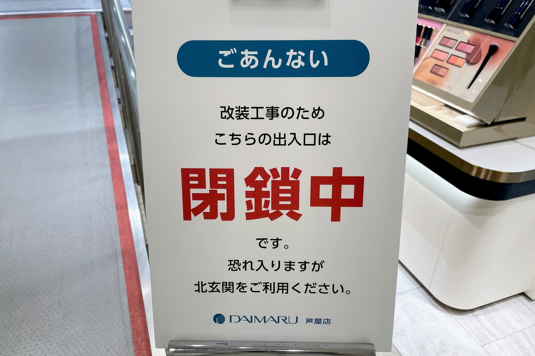 JR芦屋駅直結の百貨店「大丸芦屋店」の1階西側が、化粧品売り場リニューアルのため閉鎖されて通れなくなってます〜