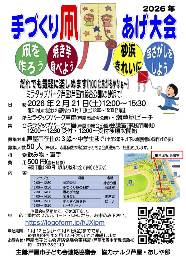 ミラタップパーク芦屋・潮芦屋ビーチで「手づくり凧あげ大会」やるみたい。3才〜中学生対象