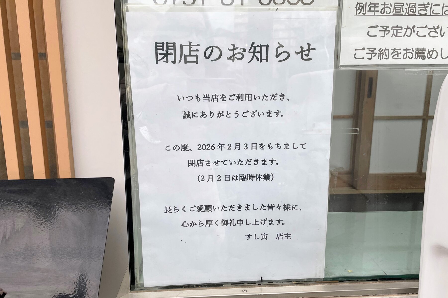 ↑店頭に「閉店のお知らせ」が出ていました。閉店前日の2月2日(月)は臨時休業なので、ご注意を〜
