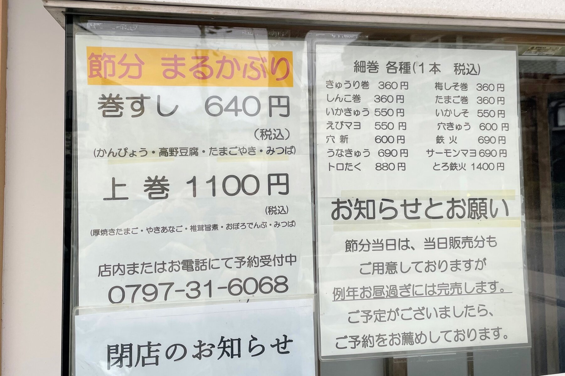 ↑現在、節分用まるかぶり巻すしの予約を受け付けているようです。ほか、各種細巻も販売しています。