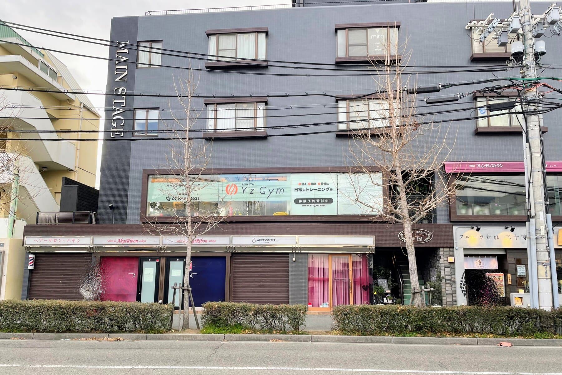 ↑JR芦屋駅のすぐ東側にある、南北に走る通り沿いにあるビルです。同建物内には唐揚げ店「きしから」、フランス料理店「Chez vous」、パーソナルトレーニングジム「Y’z Gym」などが入っています。