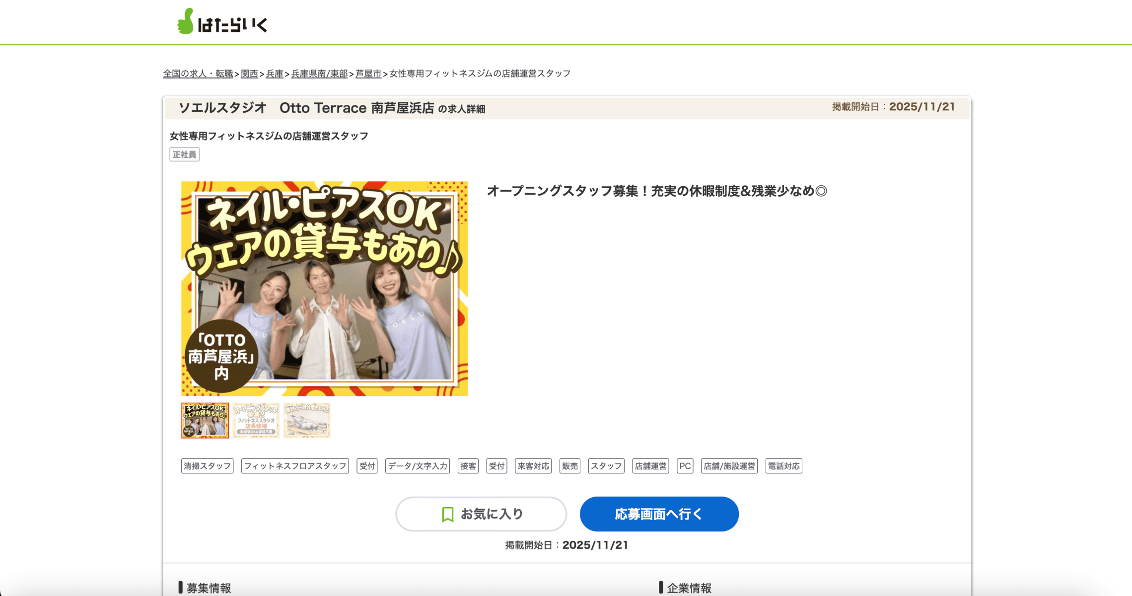 女性専用フィットネスジム「ソエルスタジオ Otto Terrace 南芦屋浜店」は5月ごろのオープンを予定しているようで、オープニングスタッフの求人が出ていました。