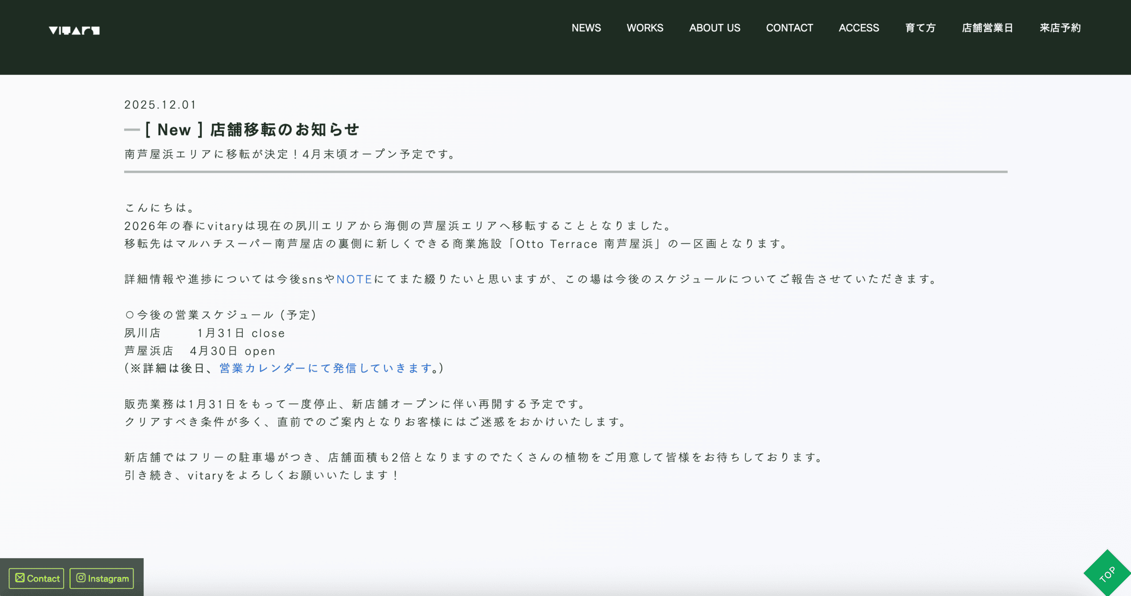 西宮市・夙川にある観葉植物専門店「vitary(ウィータリー)」が「Otto Terrace 南芦屋浜」へ移転するようです。移転オープン予定日は4月30日(木)となっています。