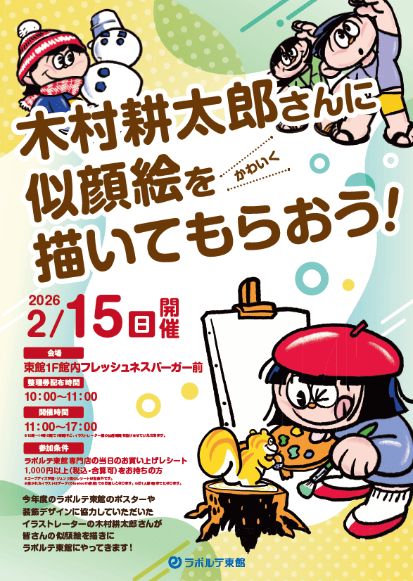 JR芦屋駅直結のショッピングモール「ラポルテ」東館で、イラストレーター・木村耕太郎さんに似顔絵を描いてもらえるイベントが2月15日(日)に開催されるみたいです〜