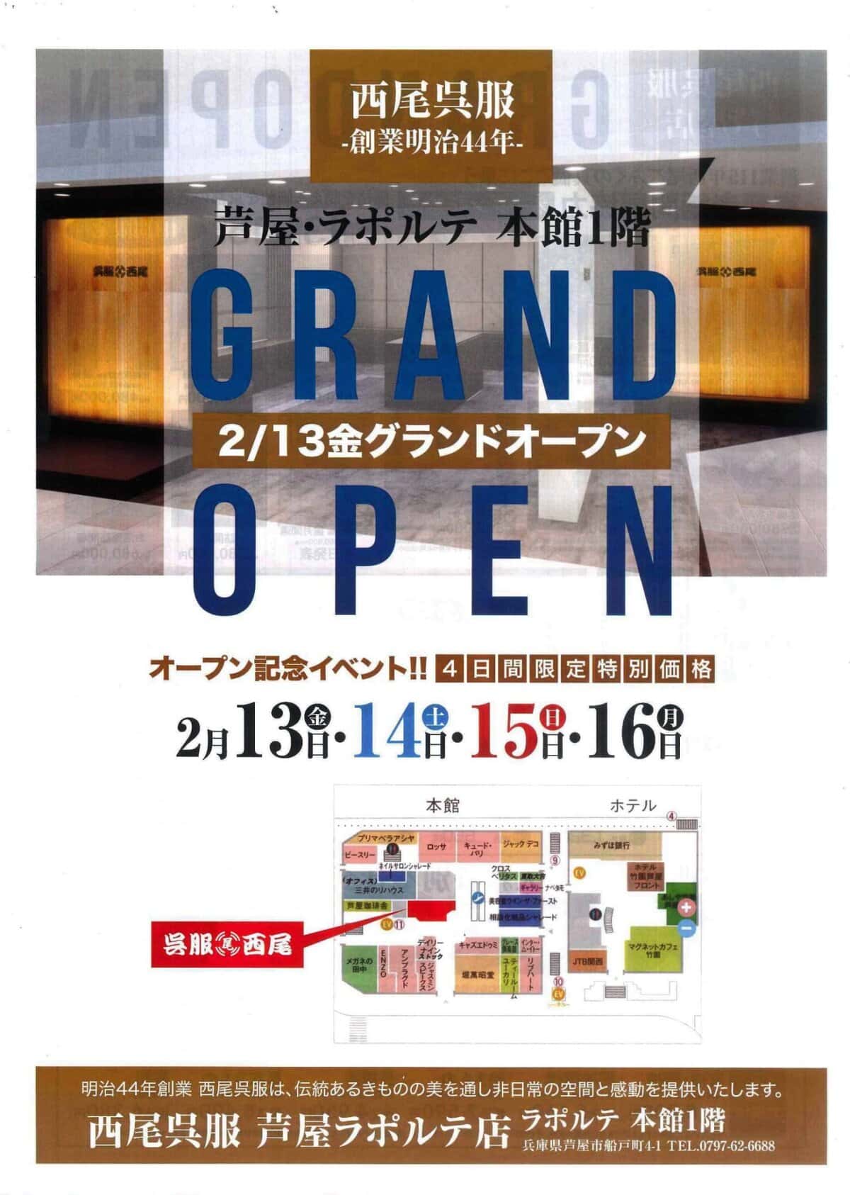 JR芦屋駅前ラポルテ本館に「西尾呉服」がきょう2/13(金)からオープンするみたい